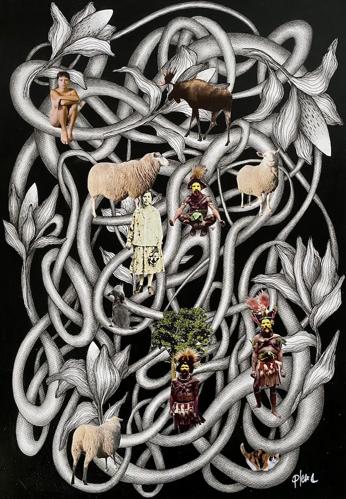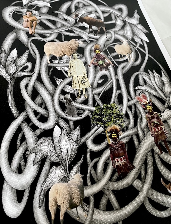 Kolaż uzupełniony odręcznym rysunkiem.